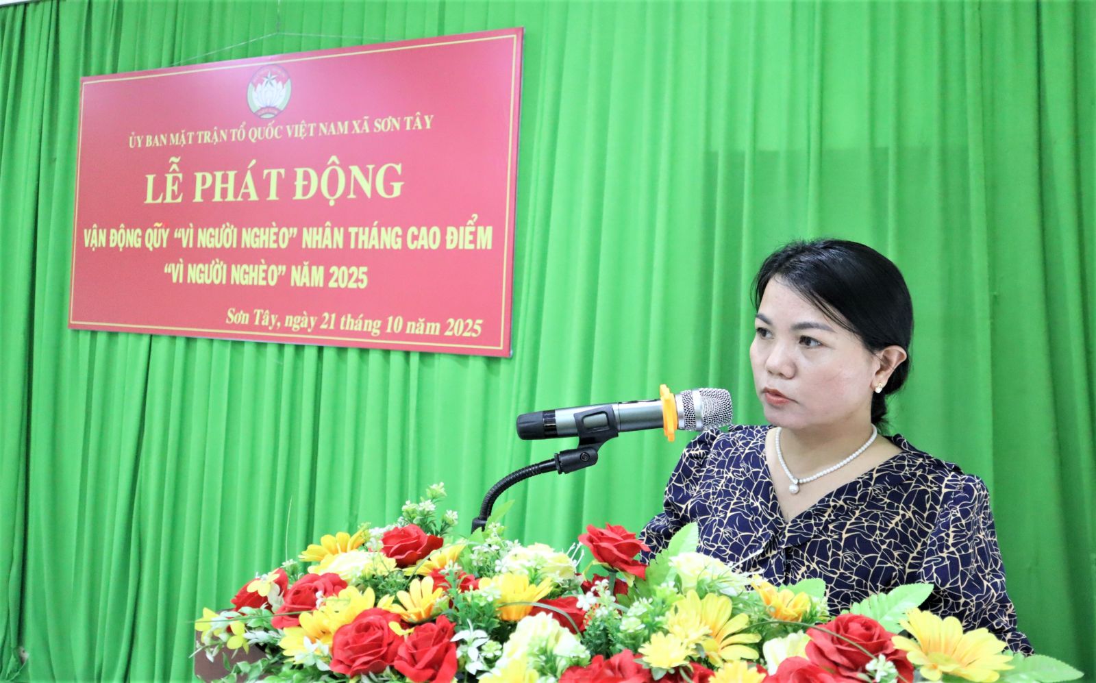 Tại lễ phát động, thay mặt lãnh đạo xã Sơn Tây, Chủ tịch UBMTTQ Việt Nam xã Sơn Tây kêu gọi các cơ quan, đơn vị, doanh nghiệp, các tổ chức, cá nhân hưởng ứng vận động “Quỹ vì người nghèo” năm 2025 bằng những việc làm thiết thực như: đóng góp “Quỹ vì người nghèo”, hỗ trợ sinh kế, sửa chữa nhà ở, thăm tặng quà cho các hộ gia đình có hoàn cảnh khó khăn….