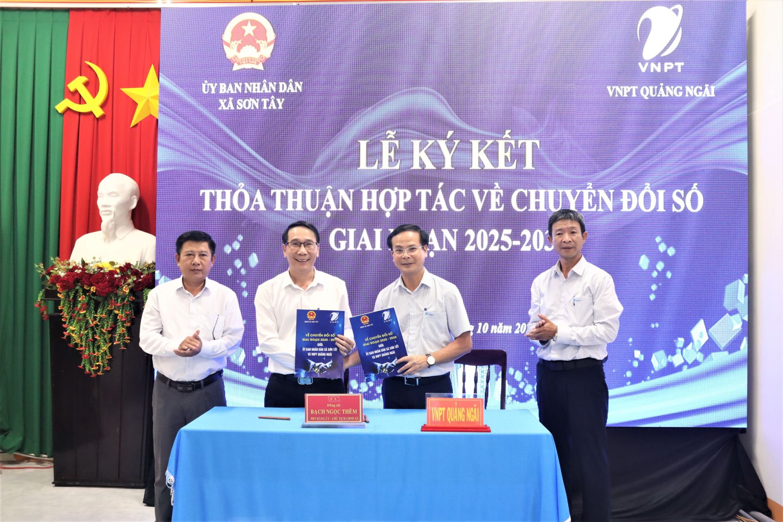 Tại lễ phát động, UBND xã Sơn Tây, Trung tâm Viettel Quảng Ngãi và VNPT Quảng Ngãi - Khu vực Sơn Tịnh ký kết thỏa thuận hợp tác hỗ trợ trong lĩnh vực chuyển đổi số tại địa phương, giai đoạn 2025 - 2030. Đồng thời, VNPT Quảng Ngãi hỗ trợ dịch cụ chữ ký số, hóa đơn điện tử trị giá 20.000.000 đồng cho UBND xã Sơn Tây.