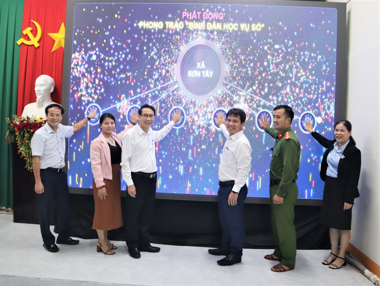 Tại buổi lễ, UBND xã Sơn Tây phát động phong trào “Bình dân học vụ số” với mục tiêu: 100% cán bộ, công chức, viên chức và người lao động trong hệ thống chính trị xã sử dụng thành thạo các ứng dụng số cơ bản. Ít nhất 90% hộ gia đình có người biết sử dụng điện thoại thông minh, truy cập Internet và sử dụng dịch vụ công trực tuyến. Tại lễ phát động, đại diện UBND xã, Đoàn Thanh niên đã phát biểu hưởng ứng, thể hiện quyết tâm chung tay xây dựng “xã hội số” tại xã Sơn Tây. Sau lễ phát động phong trào “Bình dân học vụ số”, ông Hồ Quốc Cường, Trung tâm Giải pháp Kinh doanh - VNPT Quảng Ngãi tổ chức tập huấn, hướng dẫn miễn phí cho các Hiệu trưởng, Phó hiệu trưởng các trường học; cán bộ công chức, viên chức và các trưởng thôn trên địa bàn xã.