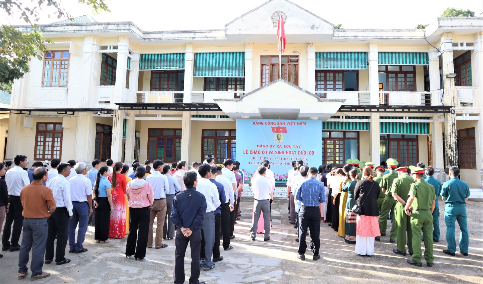 Sáng 06/10, tại sân Uỷ ban MTTQVN xã Sơn Tây tổ chức Lễ chào cờ và sinh hoạt chính trị dưới cờ định kỳ tháng 10. Tham dự lễ có các đồng chí: Đinh Trường Giang, Bí thư Đảng ủy, Chủ tịch HĐND xã; Bùi Thị Anh Dũng - Phó Bí thư Thường trực Đảng ủy xã; Bạch Ngọc Thêm, Phó Bí thư Đảng ủy, Chủ tịch UBND xã; Đinh Thị Hoa, UVBTV, Chủ tịch Ủy ban MTTQVN xã; Cùng các đồng chí trong Ban Thường vụ Đảng ủy, Ban Chấp hành Đảng bộ xã; các đồng chí là trưởng, phó các cơ quan tham mưu giúp việc Đảng ủy; các cơ quan chuyên môn thuộc UBND xã; cơ quan Uỷ Ban Mặt trận Tổ quốc VN xã; đại diện Lãnh đạo TT Y tế Sơn Tây; Hạt Kiểm lâm số VII, đại diện BGH các đơn vị trường học trên địa bàn và toàn thể cán bộ, công chức, người lao động đang công tác tại cơ quan Đảng ủy, HĐND, UBND, UBMTTQ Việt Nam và các tổ chức đoàn thể của xã.