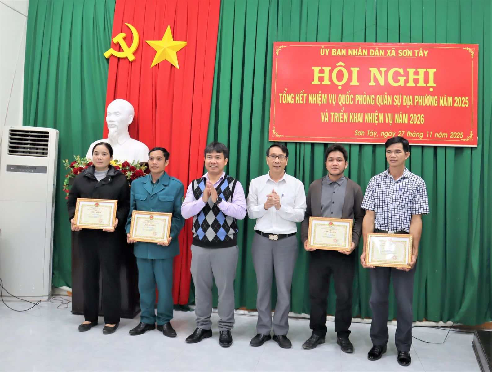 Hội nghị đã trao giấy khen cho 04 tập thể và 05 cá nhân có thành tích xuất sắc trong thực hiện nhiệm vụ quốc phòng – quân sự địa phương năm 2025.
